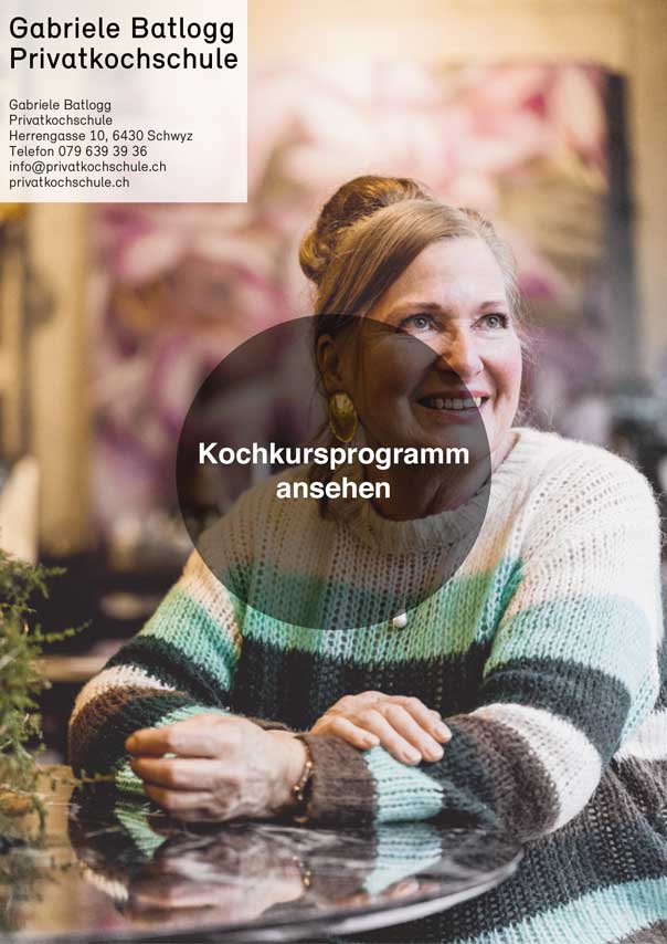 Den Aperitiv in der Hand lernt man sich kennen und entdeckt Gemeinsamkeiten: zum Beispiel die Lust am Kochen. Die feinen, leisen Düfte aus der Küche lassen das Kocherlebnis erahnen. Wenn auch Ihnen der Sinn danach steht, so bestellen Sie bitte per E-Mail mein aktuelles Kochkursprogramm. Die Kochkurse finden ab Oktober 2025 am neuen Kursort im s‘zäni, Hofartencafe und Kochschule Gabriele Batlogg an der Herrengasse 10, einer versteckten idyllischen Oase, hinter dem Haus Bären mitten im Zentrum Schwyz statt.
